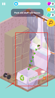 3、在棕色衣柜旁边有一个贴着“Other”标签的白色箱子。窗台上摆放着杯子和绿植,上方有提示“Pack old stuff into boxes”,右上角显示了一个图标和数字0。