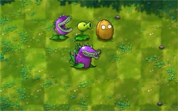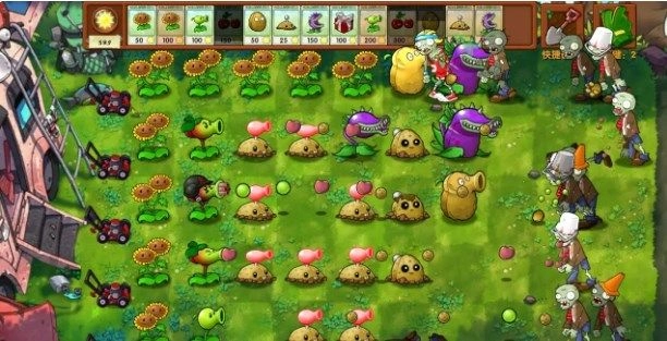 2、用高度超过向日葵的坚果守护其中一路,其余道路可全部种上“豌豆土豆雷”与“豌豆坚果墙”