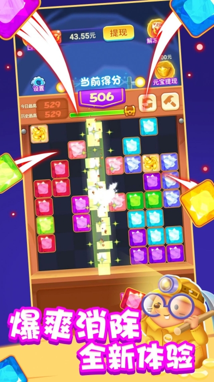 方块赚钱乐红包版是一款以消除玩法进行挑战的闯关游戏。游戏中,方块以不同颜色区分,且依照特定图案设计。每一次挑战关卡,难度都会有所变化。只要摸索出精准的技巧,就有成功的希望。凭借充足的信心去达成目标,便能轻松冲击最佳排名,赢取丰厚奖励。