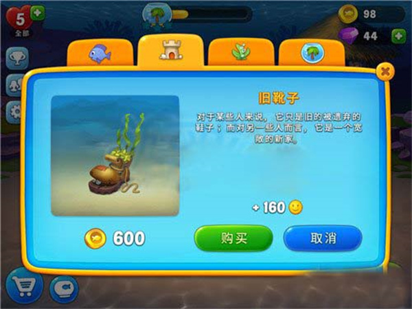 4、当你购买成功,小丑鱼就会现身于你的水族箱内,与此同时,你还能获得一个笑脸。只要集齐一定数量的笑脸,就能提升水族箱的等级。