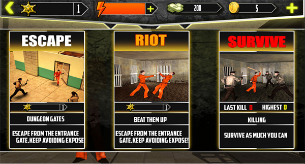 1、下载安装好暴力越狱游戏,进入游戏有三种模式可以选择,逃脱、暴乱和生存。