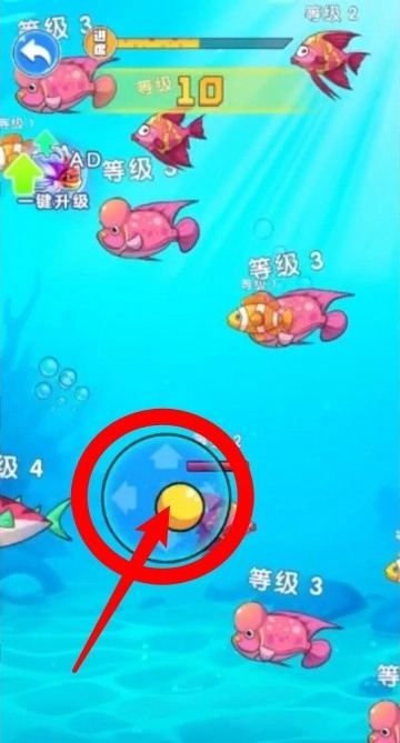 1.滑动操控方向:通过屏幕虚拟摇杆控制小鱼移动,向哪个方向滑动,角色就朝那个方向游动。