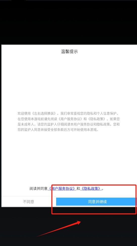 1点击“同意并继续”按钮跳过协议,进入游戏主界面,在底部可以看到“不同意”和蓝色的“确认”按钮。