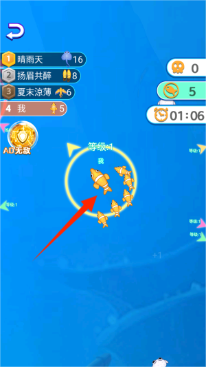 2、控制小鱼四处游弋寻找食物,通过不断吞噬其他生物来成长和进化。