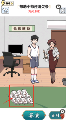 1、点击负债的小帅关卡,查看帮助小帅还债的任务说明,限时888秒完成。