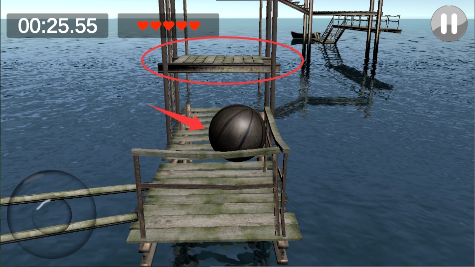 2、通过左侧虚拟摇杆控制弹球移动方向,注意观察场景中的障碍物分布,提前规划行进路线。