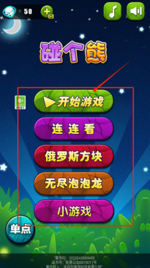 2、点击彩色游戏按钮如开始游戏进入玩法,或点连连看等选择不同游戏,顶部可调整音量。