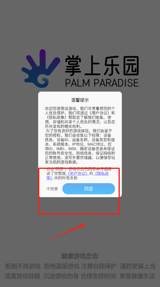 1、点击蓝色同意按钮接受隐私协议,或点不同意放弃登录,底部有健康游戏提示。