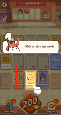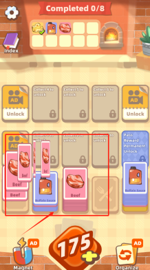 2、点击卡片来收集食材,集齐指定数量后解锁新卡片,并使用磁铁来整理桌面上的杂物。