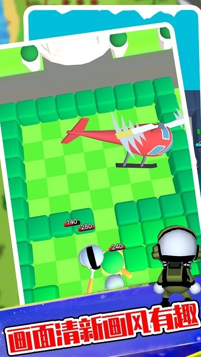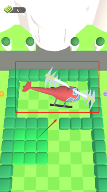 2、红色直升机在绿色场地飞行,上方显示金额,可能用来购买道具或升级装备。
