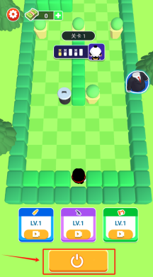 1、点击关卡1开始游戏,底部有三个LV.1按钮可以选择不同的角色,橙色的按钮看起来像是用来暂停或退出的。