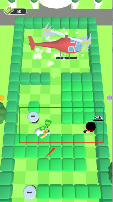 3、绿块场地里有直升机和两人,一人躺着有钱袋,另一人站着显示250金币数值。