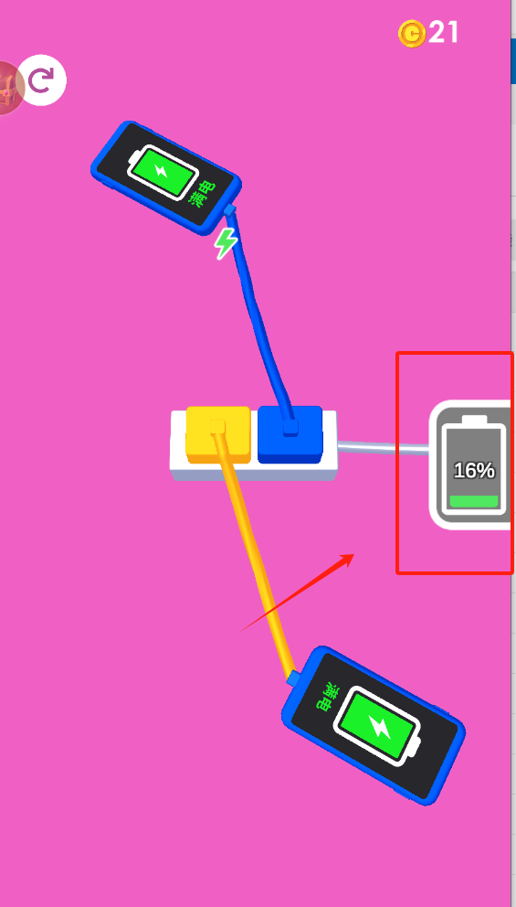3、两部手机同时充电,一部满电一部16%,赚到21金币。