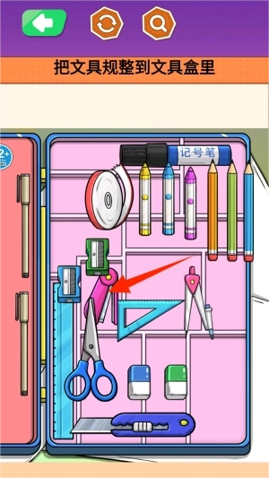 3、长按屏幕中的铅笔、橡皮等物品,将其拖拽至对应格子内,完成收纳任务获得满足感。