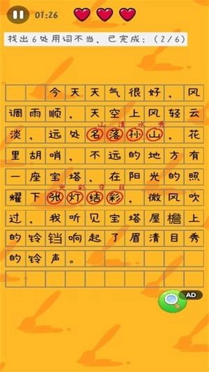 1、一款休闲类小游戏,玩家需要找到所有的用词不当之处,这些词语隐藏在小学生写的作文当中。