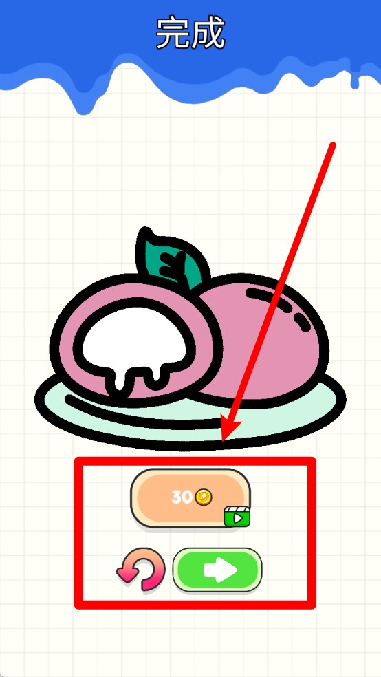 3.任务完成:完成绘画后会自动上色并显示完成界面,同时获得金币奖励并可选择进行下一关。