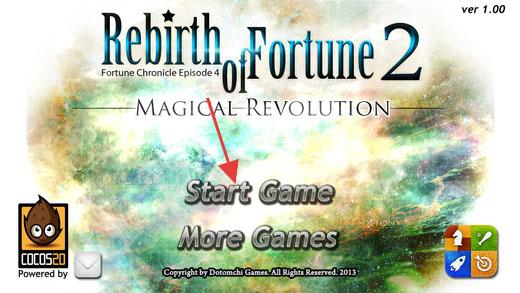 1、在游戏启动界面上,会显示“Rebirth of Fortune2”和“MAGICAL REVOLUTION”,点击“Start Game”即可开始游戏,同时还有“More Games”的选项。