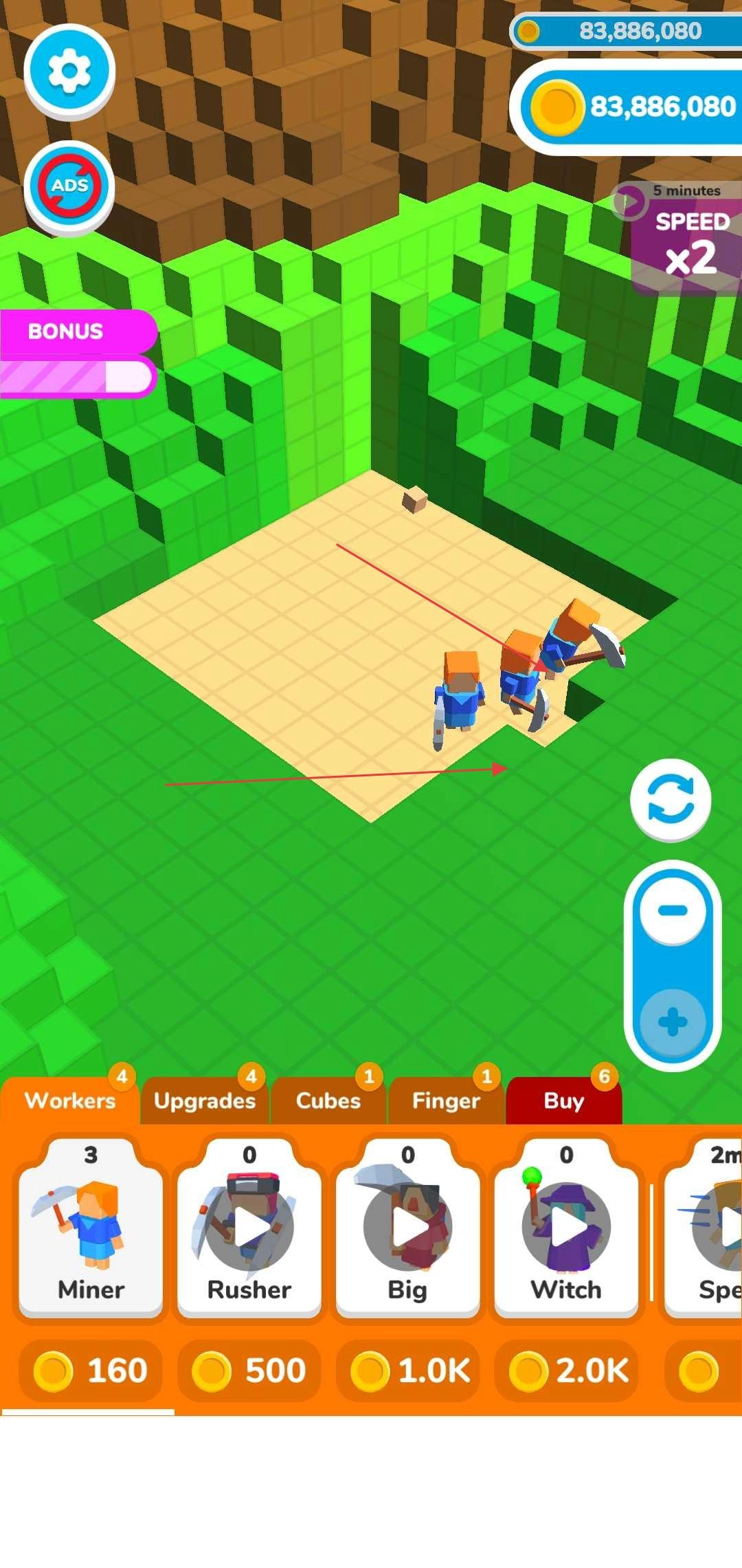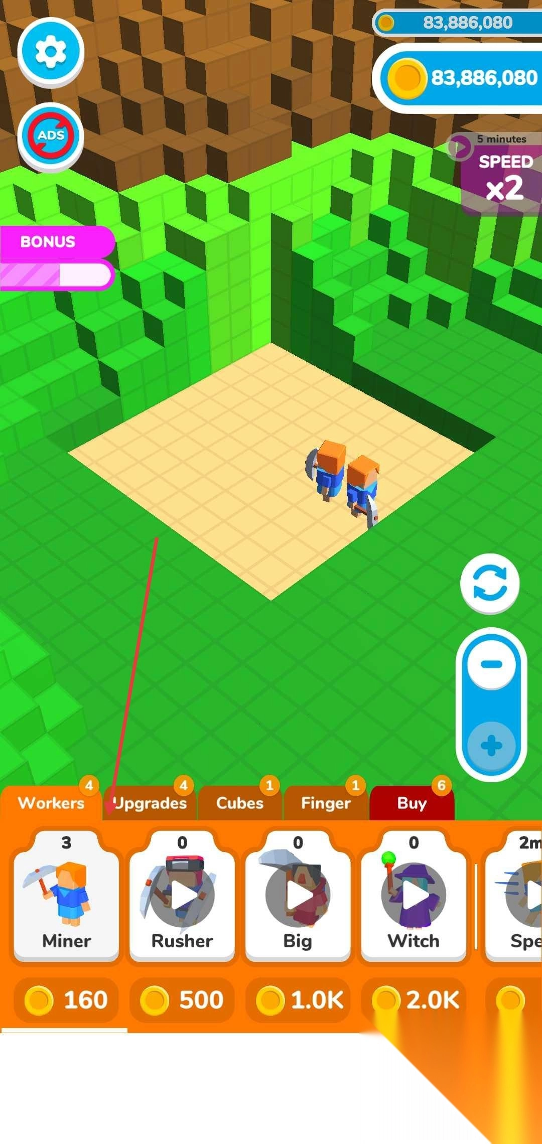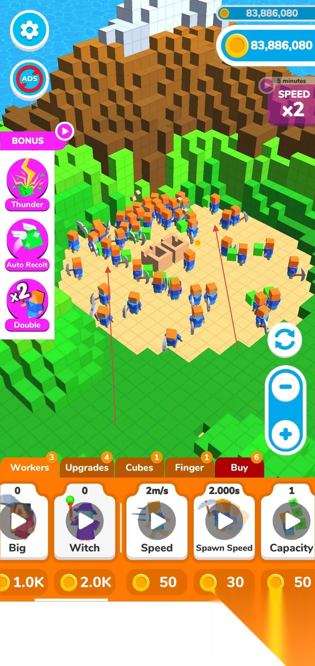 1. 通过花费金币来购置不同种类的矿工,并将他们安置在矿场范围内,使他们能够自动挖掘方块,进而获取资源。