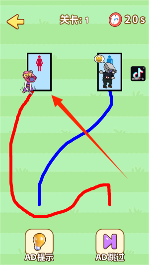 2、用手指绘制路径线,分别将两个角色引导至对应性别的厕所标识处,路线需保持清晰不重叠。