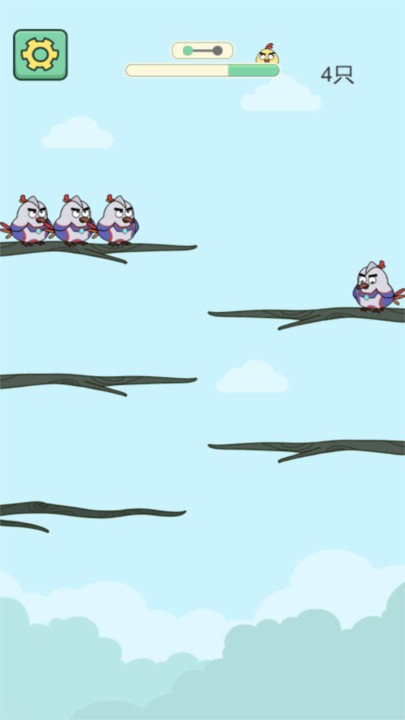 1、核心玩法要求观察树枝布局,通过拖拽将同色小鸟移动至同一树枝完成四只组队消除。