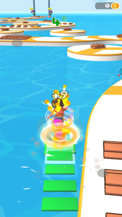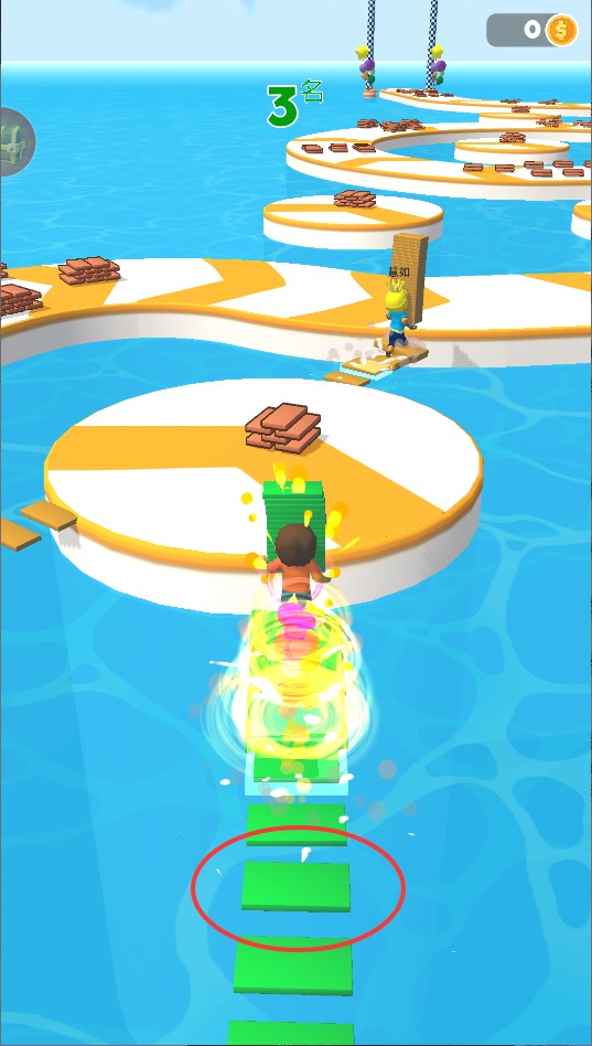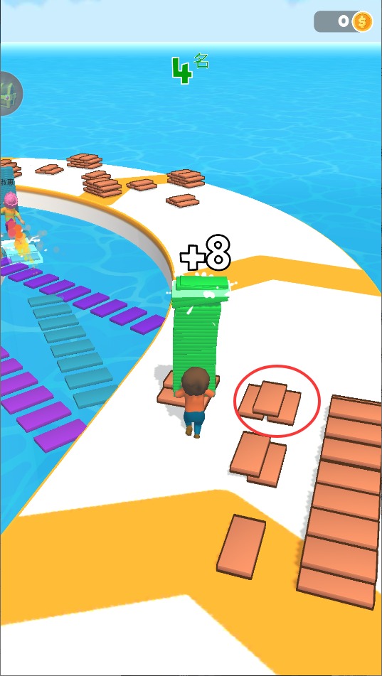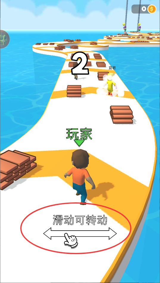 1、核心玩法是收集场景中的木块道具,在合适位置搭建浮桥。通过创造捷径超越对手,率先抵达终点获胜。