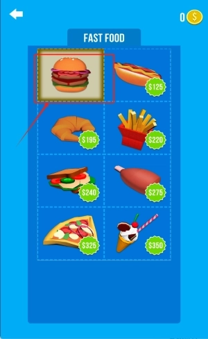 1、在商店界面浏览各种快餐的价格,红框标注的汉堡售价为125美元,点击购买后将从金币余额中开始扣除,直到余额为0。