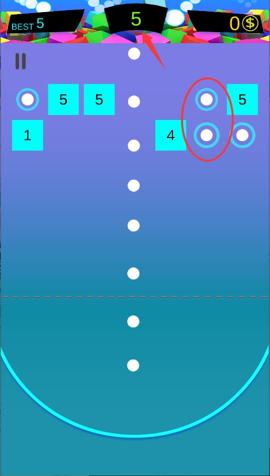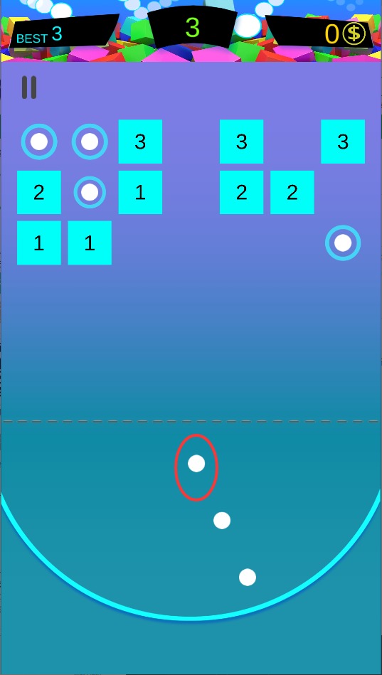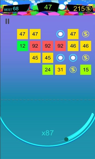 2、通过点击屏幕来调整射击的角度,控制弹球击中砖块的位置,并利用反弹效果连续打碎多个目标以获得积分。