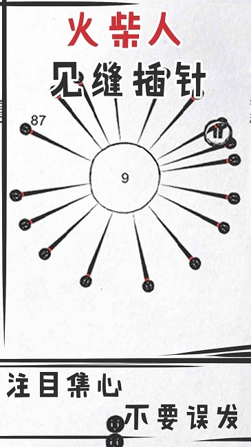 3、注意若射中实体部分会导致失败,需预判轨迹精准操作,成功插完所有火柴人即可通关。