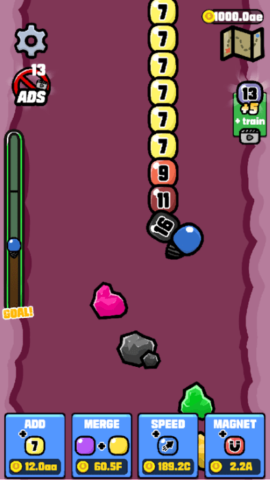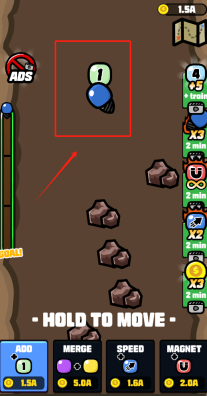 1、点击ADD花费1.5A来添加带有数字1的球,使用MERGE花费5A合并相同数字的球以进行升级,通过按住HOLD TO MOVE来控制移动。