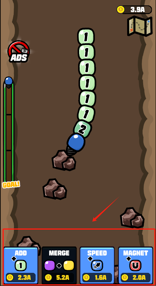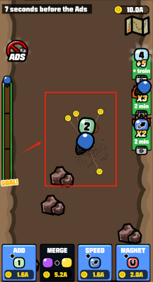 2、点击ADD消耗6A添加带数字4的物件,7秒后会出现广告,用MAGNET花2A吸金币,点击MERGE合成升级。