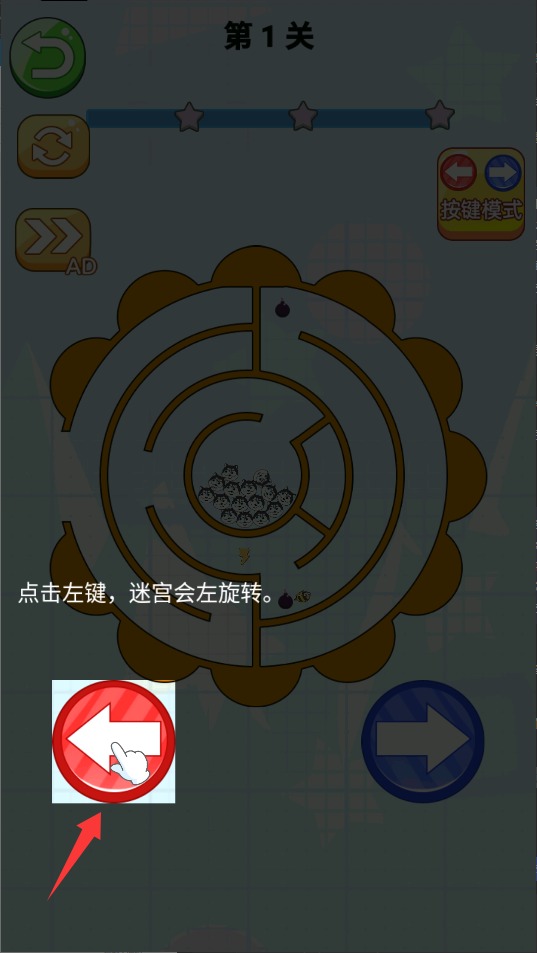 2、通过点击屏幕两侧的方向键,灵活转动迷宫以改变通道的方向,为角色开辟新的前进路线避开障碍。