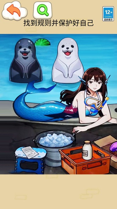 1点击橙色的开始游戏按钮,进入海底世界,在游戏中你将扮演一个手持杆子和桶的角色,并请注意左上角显示的年龄提示。