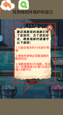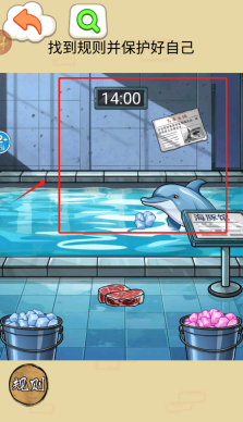 2、阅读告示了解喂食规则:每天14点喂食,食物颜色要匹配海豚,必须喂3次。