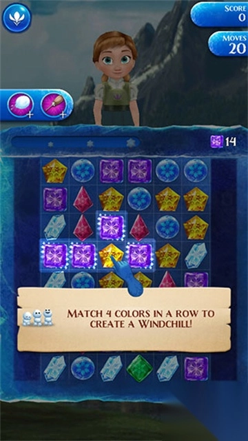 3、丰富多彩的角色系统,超过10位电影角色登场。艾莎具备冰冻技能,安娜则善于激励士气,这些特殊技能能够改变消除的效果。