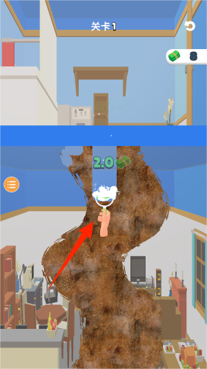 2、使用清洁工具,拖动至脏污区域进行清理,每处干净的地板都会掉落可拾取金币。
