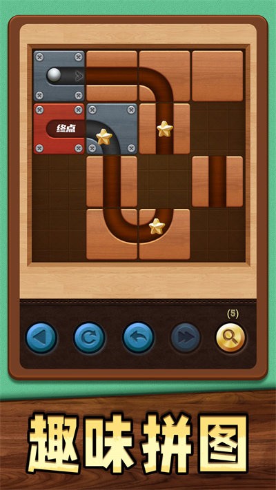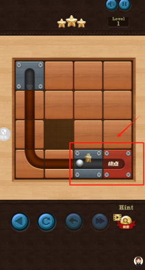 3、操控木质方块拼接路径,引导球球到终点,右下角按钮辅助通关。