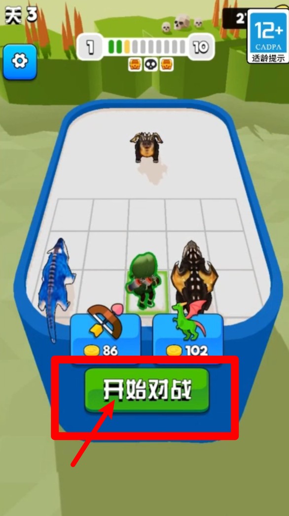 2.点击开始对战:将恐龙拖入格子并完成布阵后,点击“开始对战”按钮,即可正式进入战斗阶段。