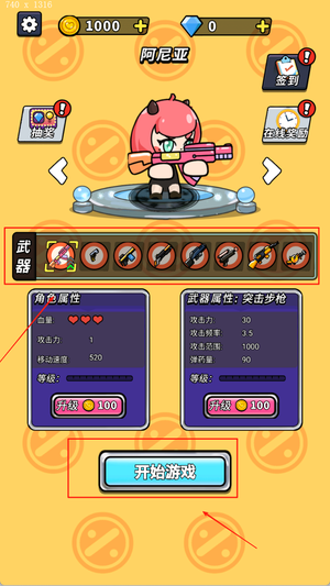 1、游戏开始后,挑选你的角色和初始武器,进入关卡后会遇到大量敌人。通过滑动屏幕来控制移动方向,并点击攻击按钮来进行射击。