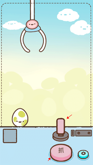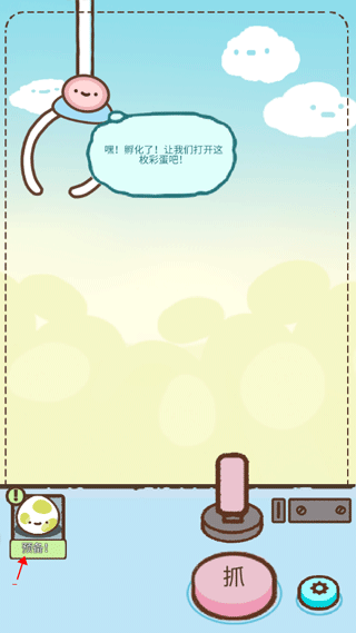 1、打开游戏后,会有一项简单的抓彩蛋操作,以便让你快速熟悉该过程。首先,按住上方的杆子来移动最上方的爪子,待移动至合适位置时,点击下方标有“抓”字的按钮。