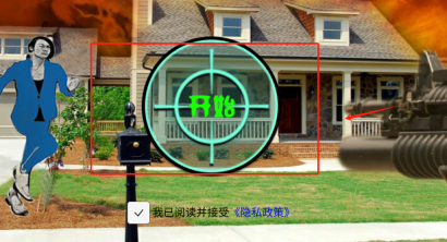 1、点红框里开始按钮,勾选隐私政策,准备好用枪破坏房子,游戏马上开始。