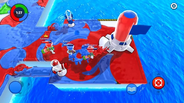 1. 阵营分队机制:采用红黄蓝三大阵营设定,玩家需与同阵营(同色)队友协同作战,以喷涂占地的方式展开阵地对抗,带来紧张且欢乐的乱斗体验,战斗全程需高度专注,不容分心。