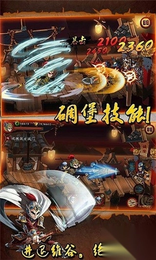 1、控制角色在城门场景中,使用虚拟按键进行移动和攻击,抵御敌人,保护城门不被攻破。