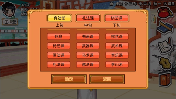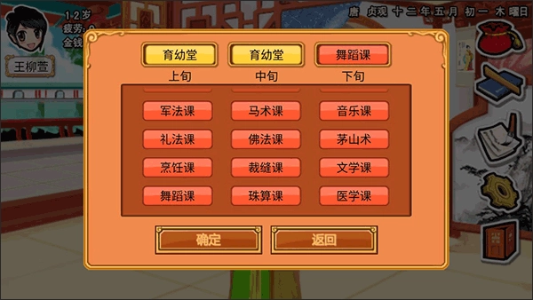 补属性建议:农业课(智力)、棋艺课(心机)、客栈(自信)、戏班(气质)、文学课(口才)
