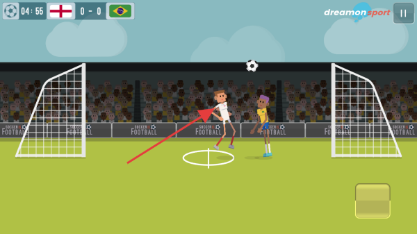 2、比赛时,控球员争顶、传球,避对方防守,找时机射门,注意时间(04:55)与比分,争取进球。