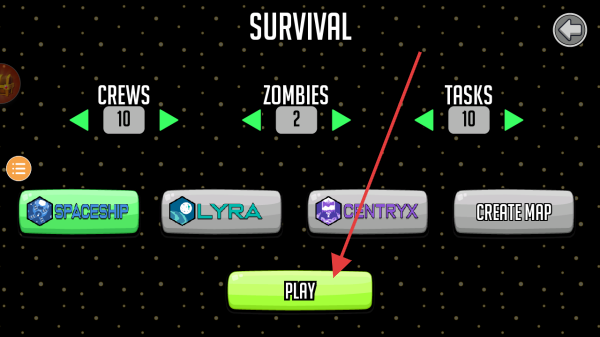 2、在生存模式下,设置“CREWS10”“ZOMBIES2”“TASKS10”,选择地图(例如太空船),点击“PLAY”开始游戏,对抗僵尸并完成任务。