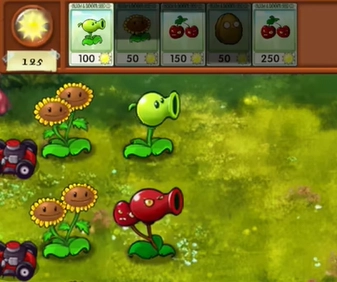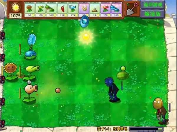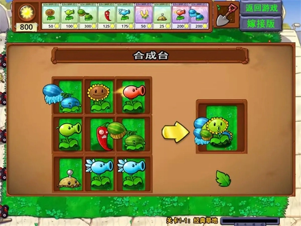 4、进入游戏后,画面呈现如图所示。此时,玩家能够将两种植物种植在同一个格子里,从而合成出融合版的植物。例如,将向日葵与豌豆射手进行融合,就会得到向日葵豌豆射手。