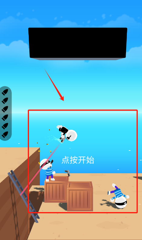 2、看沙滩上的小人,点开始后躲避天上飞的黑白物体,小心别被砸中。