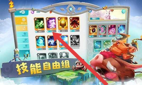3、进入技能界面后,根据“技能自由组”的规则,选择箭头所指的技能卡进行搭配组合,以定制你的战斗技能体系。