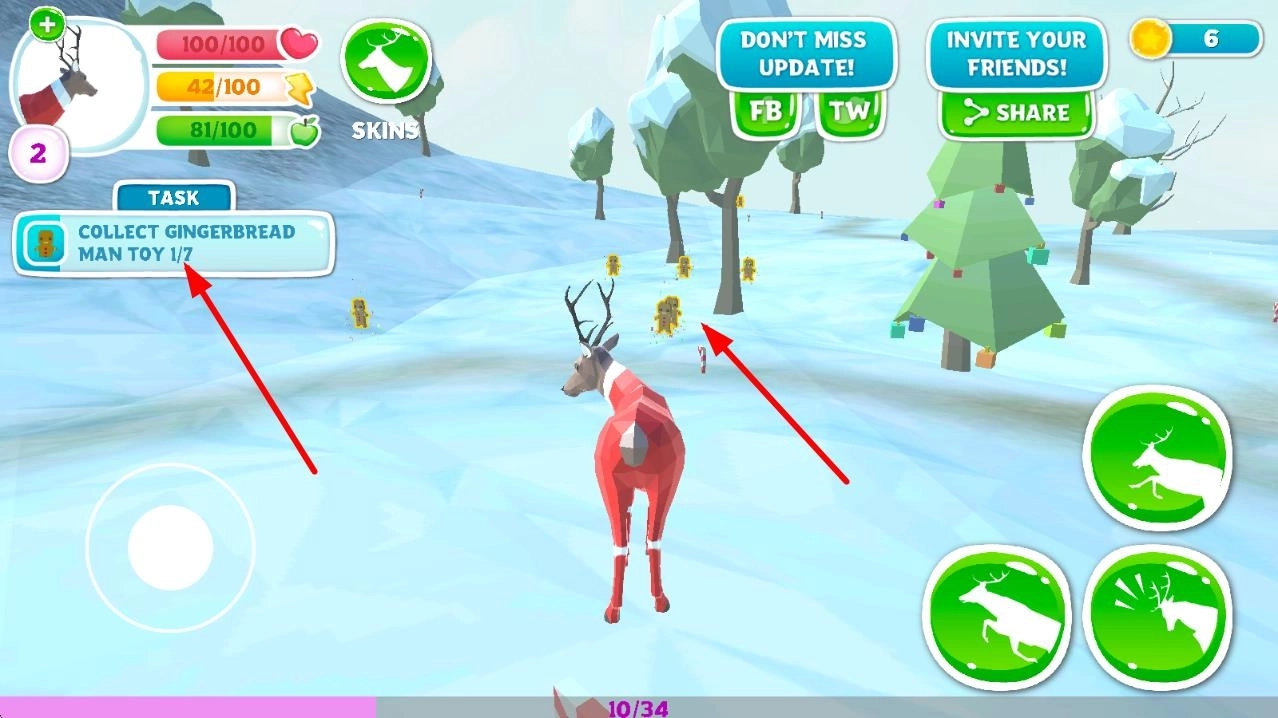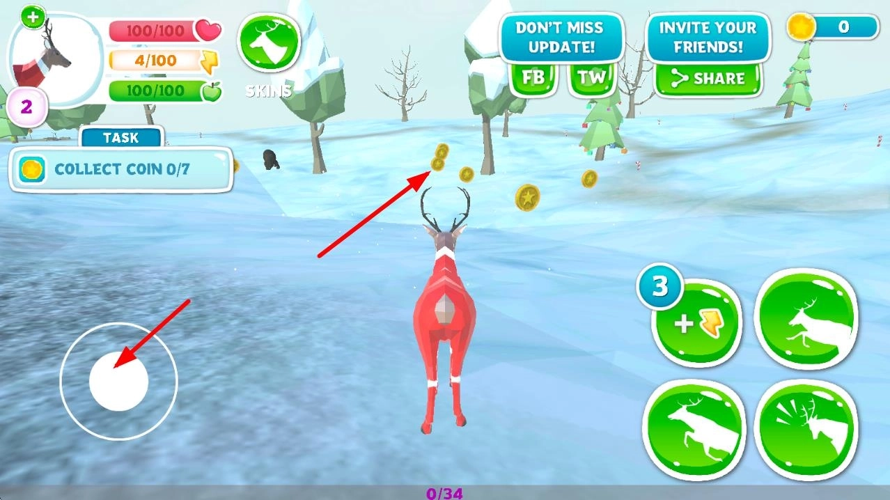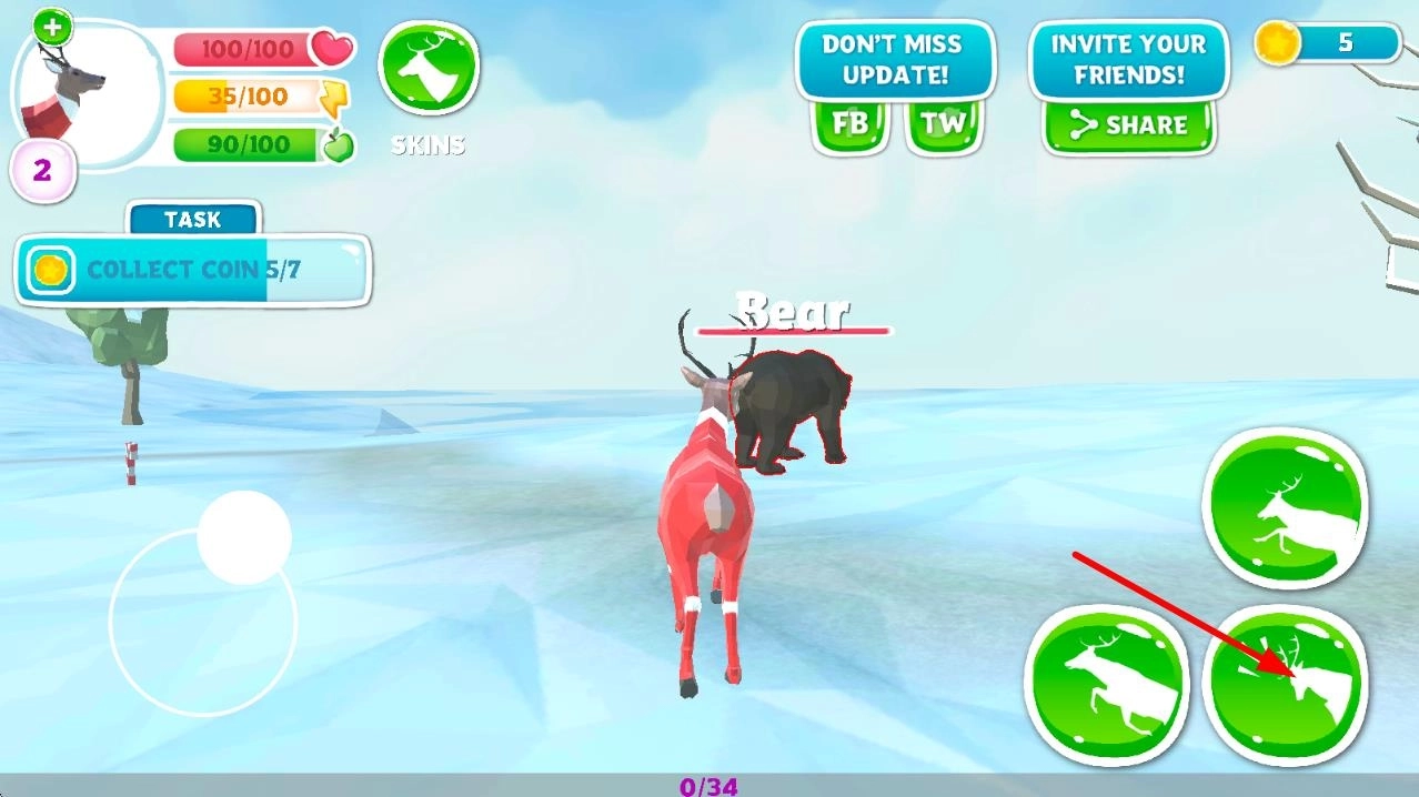 2、遇到敌对动物时,点击攻击键释放武器技能,击败它们可获得金币,食用金币能让鹿的体型变大、属性提升。