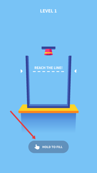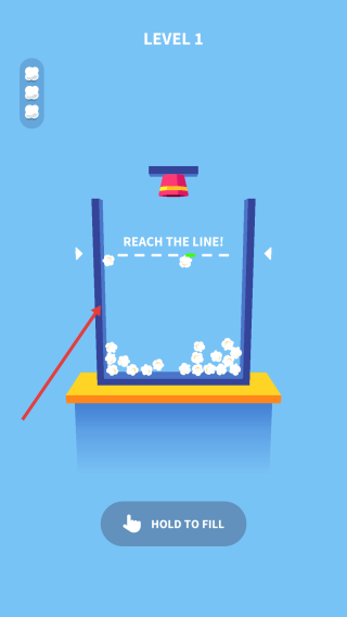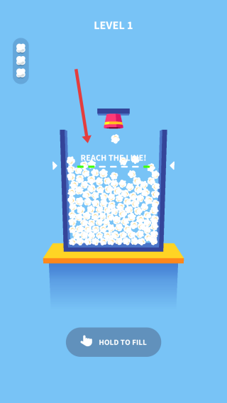 1、开始关卡:点击“HOLDTOFILL”按钮,开始向容器中填充白色物体(类似爆米花)。